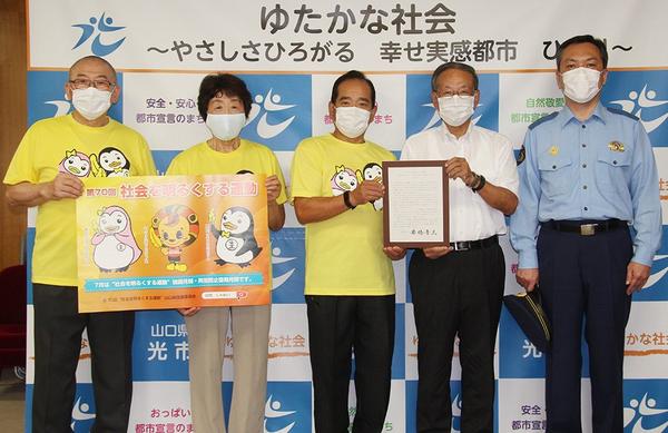 犯罪や非行の防止と罪を犯した人の更生を訴える「社会を明るくする運動」の首相メッセージの光市長への伝達式が15日、市役所で開かれ、光・下松保護区保護司会光支部の...