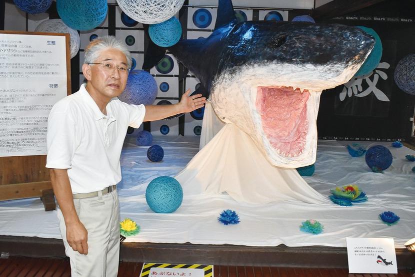 光市室積の光ふるさと郷土館に1999年7月に同市で捕獲されたホオジロザメのあごの骨の口蓋骨と、職員が手づくりした長さ4メートルもあるホオジロザメの模型が展示さ...