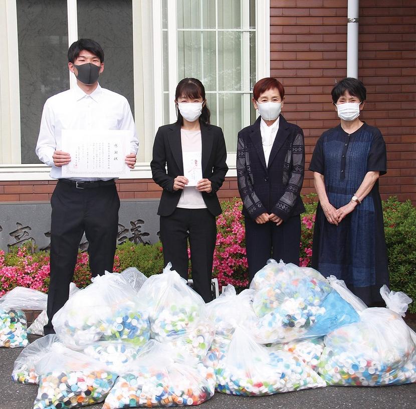 光市の武田薬品工業光工場(藤原英喜工場長)で従業員約千人が1年がかりで集めたペットボトルのふた(エコキャップ)約115キロが2日、光商工会議所女性会(平島千代...