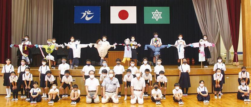 かかしと中本さん、長尾さんを囲む児童