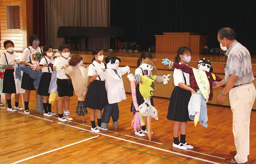かかしを渡す児童