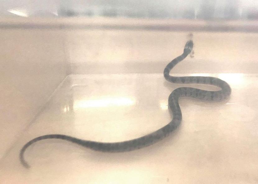 体長はわずか7センチと小さいが、体が白と黒のまだらできれいに覆われている。周南市の徳山動物園に特徴を伝えて問い合わせたところ、準絶滅危惧種のシロマダラヘビの可能性が高いとわかった。