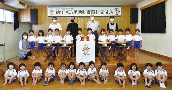 ピカピカの太鼓に大喜び! 野原保育園に宝くじ助成金で 幼年消防クラブ活動に