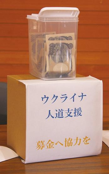 会場のウクライナ人道支援募金箱