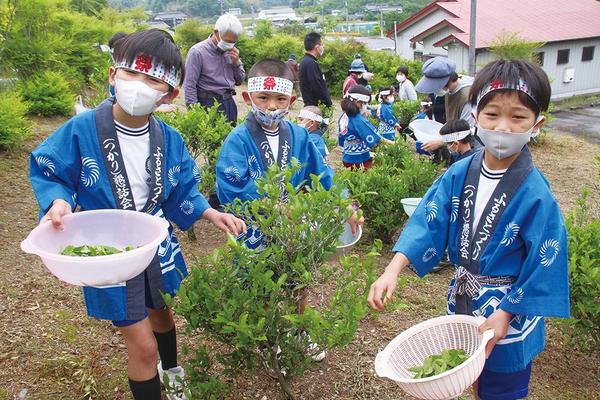 「お茶がたくさん収穫できたよ」 束荷小児童楽しく茶摘み 来客用や児童のうがいに