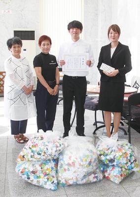 光商議所女性部に託して 山口県光市の武田薬品工業光工場(藤原英喜工場長)で従業員が1年がかりで集めたペットボトルのふた(エコキャップ)約139・5キロが7日、...