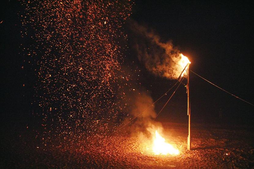 たいまつを投げ上げる子ども 参加した周防小6年生と教員 旭橋には幻想的なぼんぼりも 山口県光市周防地区に伝わる炎の祭典、周防柱松が27日夜、立...