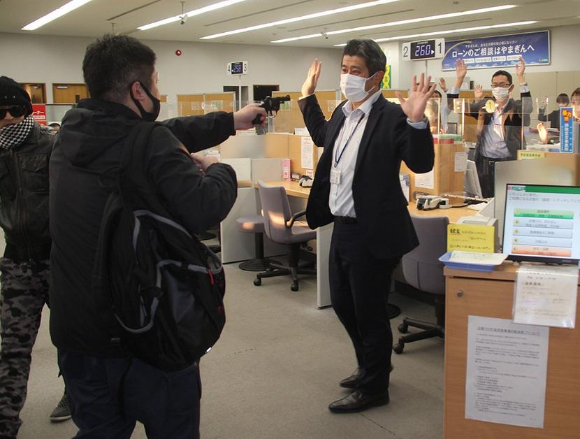 行員をけん銃で脅す犯人役