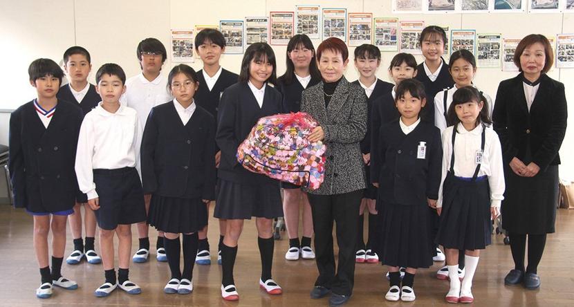 児童からふたの袋を受け取る平島会長(前列左から5人目)