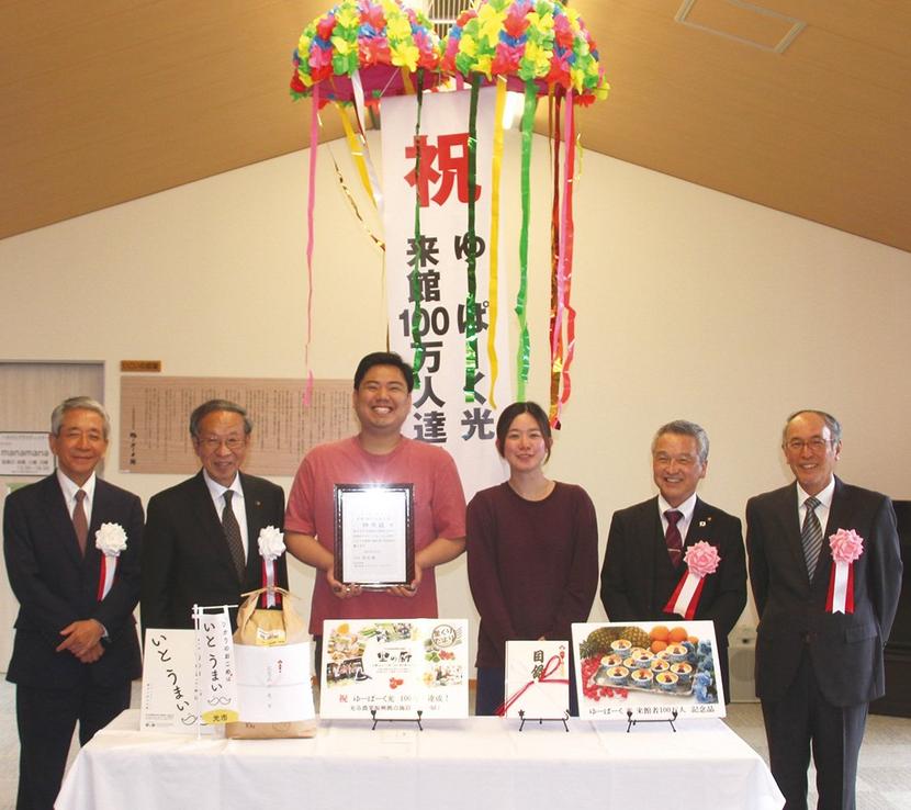 山口県光市三井の三島温泉健康交流施設・ゆーぱーく光(津川輝久支配人)の来館者数が5日で100万人になり、100万人目の上島田の会社員、榊原綾さん(25)と妻の...
