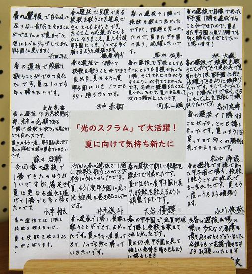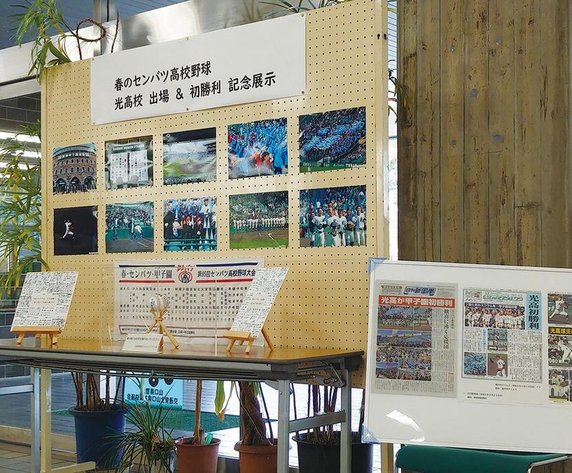 春のセンバツ高校野球大会に出場した光市の光高野球部の出場記念展示コーナーが、市役所1階ロビーに設けられている。5月11日(木)まで。 出場メンバーのサイン入...