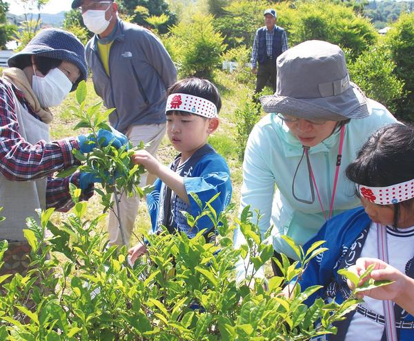 山口県光市の束荷小(福田康子校長、19人)の1年生から4年生までの14人と束荷幼稚園児2人が12日、学校の近くにある県有地のふれあい茶園で茶摘みを体験した。約...