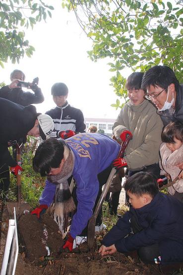 カプセルを掘り起こす卒業生