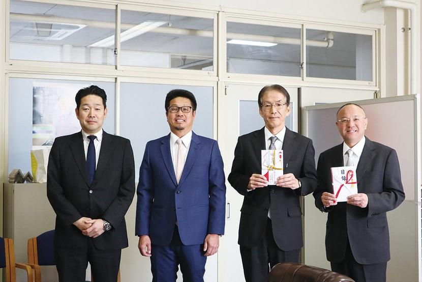 左から森藤支店長、冨士岡社長、村上校長、川本会長