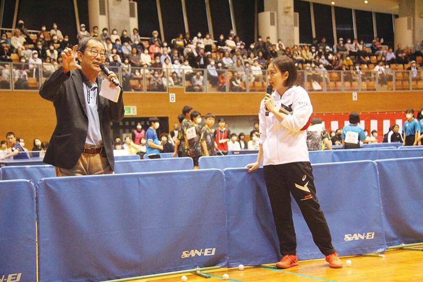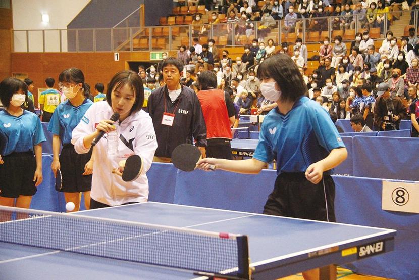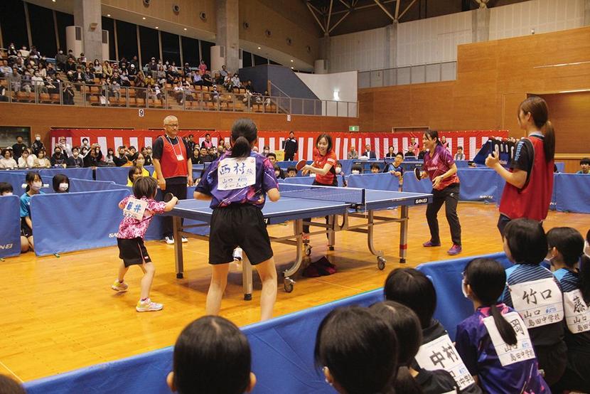 市、市教委の主催▽公益財団法人市スポーツ振興会の共催で、定員の1,500席は募集開始から数日で埋まる盛況。この日は市内各中学校の卓球部の2、3年生72人と光卓球スポーツ少年団の団員14人も参加した。
