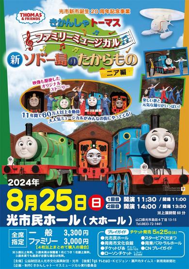 「きかんしゃトーマスファミリーミュージカル 新ソドー島のたからものニア編」(新周南新聞社など後援)が25日(日)の午前11時半からと午後2時から、光市民ホール...