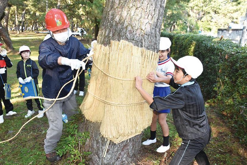 光市の虹ケ浜海岸で浅江小の3年生、室積海岸で室積小の4年生が12日、松の害虫を駆除するための「こも巻き」を体験した。 浅江小(兼坂幸雄校長)からは3年生の1...