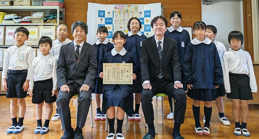 前列左から吉田校長、槻舘さん、繪柳署長と全校児童(光・熊毛郡法人会提供)