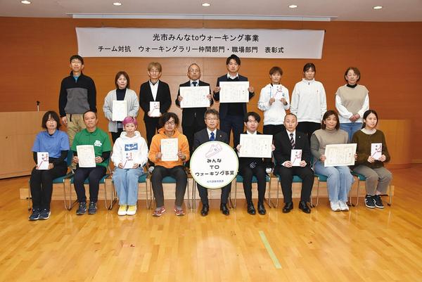 2カ月間歩いて1日の平均歩数を競う光市のチーム対抗ウォーキングラリーの表彰式が23日、あいばーく光で開かれた。「仲間部門」の優勝は光スポ少のコーチ2人のチーム...