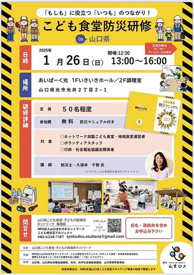 県内初の「『もしも』に役立つ『いつも』のつながり!こども食堂防災研修」が26日(日)午後1時から4時まで、光市光井のあいぱーく光で開かれる。山口県こども食堂・...