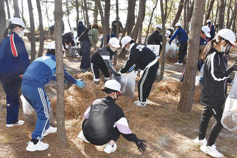 光市の虹ケ浜海岸松林ボランティア事業が24日、浅江地区コミュニティ協議会(仁藤行正会長)の主催で開かれ、浅江中1年、浅江小5、6年とその保護者、同協議会の役員...