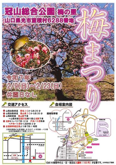 光市の冠山総合公園で2月9日(日)から23日(日)まで、第38回梅まつりが開かれる。園内の梅の里は100種類、2千本の梅が楽しめる。期間中、週末を中心にステー...