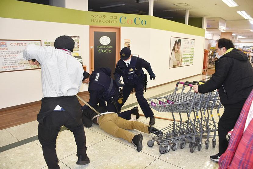 光市浅江のイオン光店(牧村利弘店長)で29日、開店前の店内で不審者対応訓練があり、大声をあげながら店内を歩いて回る不審者を、従業員が買い物用のカートを使って誘...