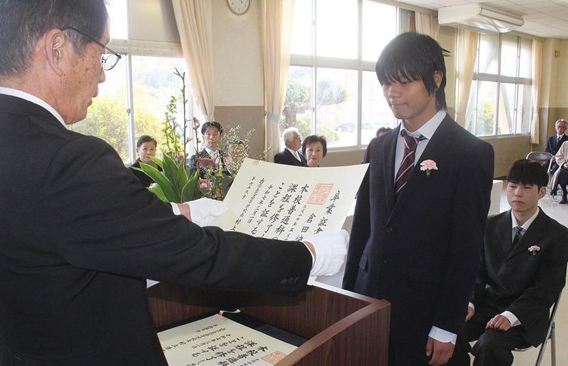 村上校長の式辞に続いて来賓の芳岡統市長が祝辞を述べ、卒業生の倉田快星さん(19)▽正中湧貴さん(20)▽竹田清寿さん(19)が「卒業できたことに感謝しています」などとお礼の言葉を述べ、感極まって声を詰まらせる瞬間もあった。