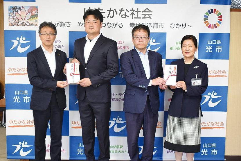 光市の熊谷興業㈱(熊谷朝和代表取締役)が70万円、山口銀行が10万円を光市に寄付した。13日に熊谷代表取締役、同行光支店の武居直人支店長が市役所を訪れ、受納式...