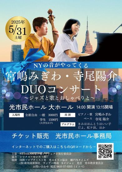 ニューヨーク在住のジャズ作曲家、ピアニスト、プロデューサーの宮嶋みぎわと、日本を代表するベーシストの寺尾陽介の「DUOコンサート〜ジャズと歌とおしゃべり」(新...