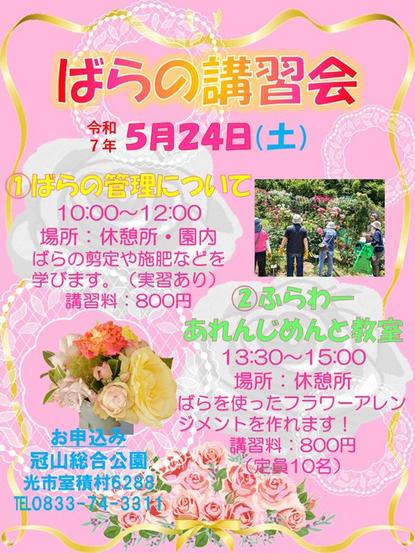 光市室積村の冠山総合公園で24日(土)、ばらについて学べる「ばらの講習会」が開かれる。バラを使ったワークショップも用意されている。 講習会は「ばらの管理につ...