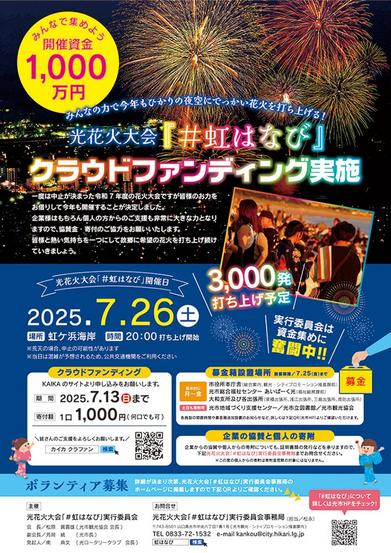 地域光市光市虹ケ浜で7月26日(土)に開かれ、3千発を打ち上げる市民参画型の光花火大会「♯虹はなび」開催に向け、ボランティアの募集が始まった。募金活動のポスター、チラシも市内外で掲示、配布が進められている。