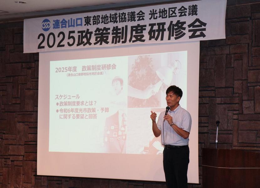 連合山口東部地域協議会の光地区会議(川尻勇代表)の「政策制度研修会」が18日、光市のホテル松原屋で開かれ、連合山口推薦の芳岡統市長の市政報告や、同地区会議の「...