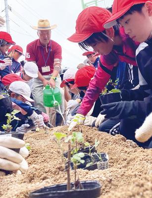 光市の浅江小(兼坂幸雄校長)で2日、4年生113人が6月4日にさし芽をして育ててきたニジガハマギクを同校敷地内の庭に定植した。多くの保護者らも参観しようと来校...