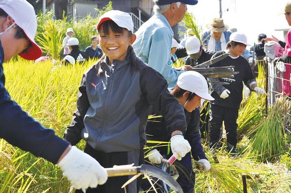 【光】室積小5年生実りの秋実感 市延の水田で稲刈り