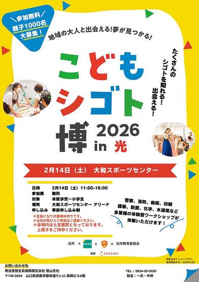 警察や消防、病院、新聞、建築など地域の企業や自治体の様々な仕事を子どもたちが体験できる「こどもシゴト博 2026 in 光」が2月14日(土)、光市の大和スポ...