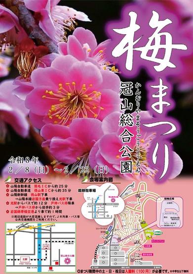 光市の冠山総合公園の梅まつりが8日(日)から22日(日)まで開かれる。期間中、冠梅広場に売店や飲食店が出店。8日(日)、14日(土)、15日(日)、22日(日...