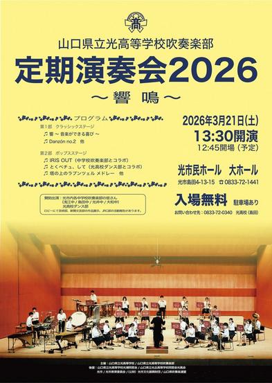 光高の「吹奏楽部定期演奏会2026〜響鳴〜」が3月21日(土)、午後1時30分から光市民ホール大ホールで開かれる。入場無料。 プログラムは第1部クラシックス...