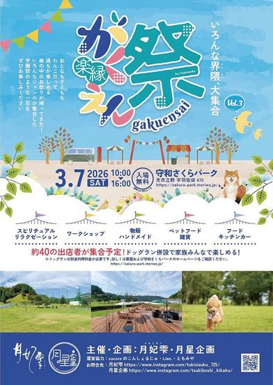 光市立野の守和さくらパークで3月7日(土)、月妃雫・月星企画が運営するイベント「楽縁祭(がくえんさい)」が開かれる。入場無料で午前10時から午後4時まで。 ...