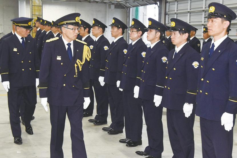 光地区消防組合(管理者・芳岡統光市長)の視閲式が10日、光市の同組合消防本部で開かれた。職員61人が参加し、芳岡管理者の通常点検を受けた。 芳岡管理者は周南...