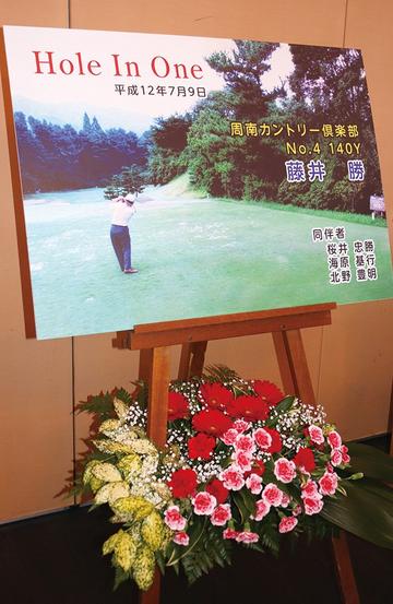 会場には2000年に周南カントリー倶楽部でホールインワンを達成した時の模型や祝福プレートが飾られたほか、思い出の写真も多数展示。藤井さんの人生の足跡を輝かせていた。