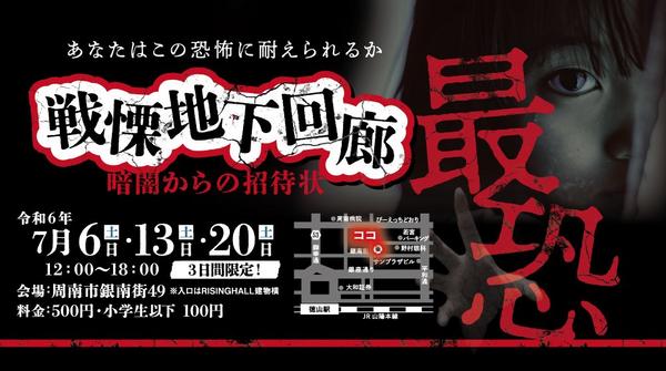 山口県周南市銀南街のRISING HALL横に6日(土)、13日(土)、20日(土)の3日間限定のお化け屋敷「戦慄地下回廊~暗闇からの招待状~」がオープンする...