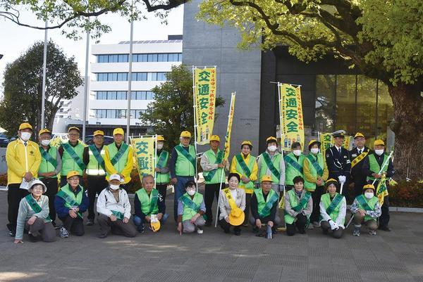 周南市老人クラブ連合会(岸村敬士会長)の見守り委員会の25人が8日朝、市役所前に集まって通学、通勤の市民、ドライバーに交通安全を呼び掛けた。 この活動は季節...