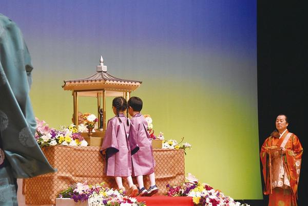周南市仏教団(河野信雄団長)の花まつり子供大会が8日、市文化会館大ホールで開かれ、舞台中央の花御堂に献花、献茶するなどの式典のあと子どもたちがアニメ映画を楽し...