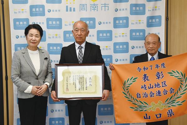 自主防災組織を県知事が表彰する消防功労者表彰を周南市の岐山地区自治会連合会(鈴木孝夫会長)が受賞した。3月30日に鈴木会長(69)らが市役所を訪れて藤井律子市...