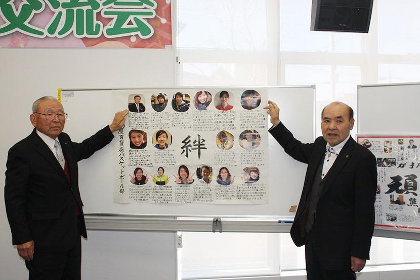 メッセージのパネルを持つ山内会長(右)と井川さん