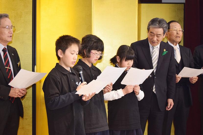 舞台で歌う卒業生と市長ら