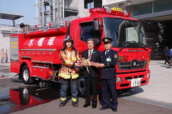 下松市消防本部(原田雄次消防長)に水の確保が困難な火災現場にも対応できる水槽車が初めて配備され、14日、同本部で配備式を開いて祝った。 水槽車は5,000リ...