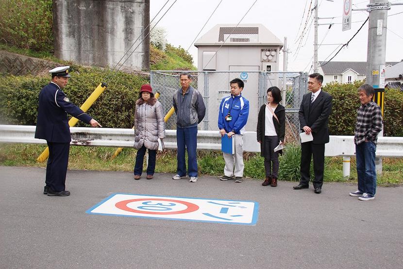 路面表示を説明する永田交通課長(左)