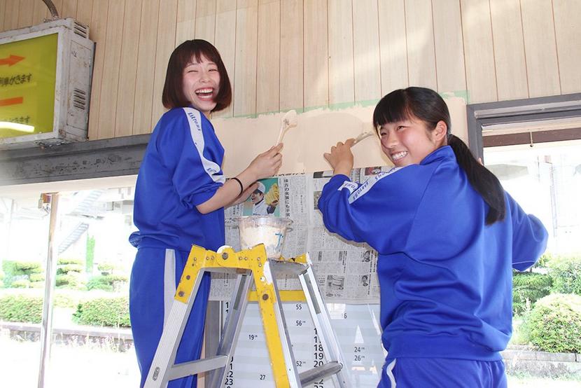 周防花岡駅でペンキを塗る女子生徒